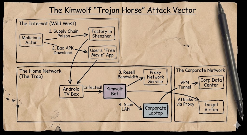 This isn’t hyperbole. The cybersecurity landscape of late 2025 has been defined by Kimwolf, a botnet that doesn’t attack from the outside—it lives inside. It has infested an estimated 1.8 million Android TV boxes, turning the “Work From Home” environment into a hostile operational theater.